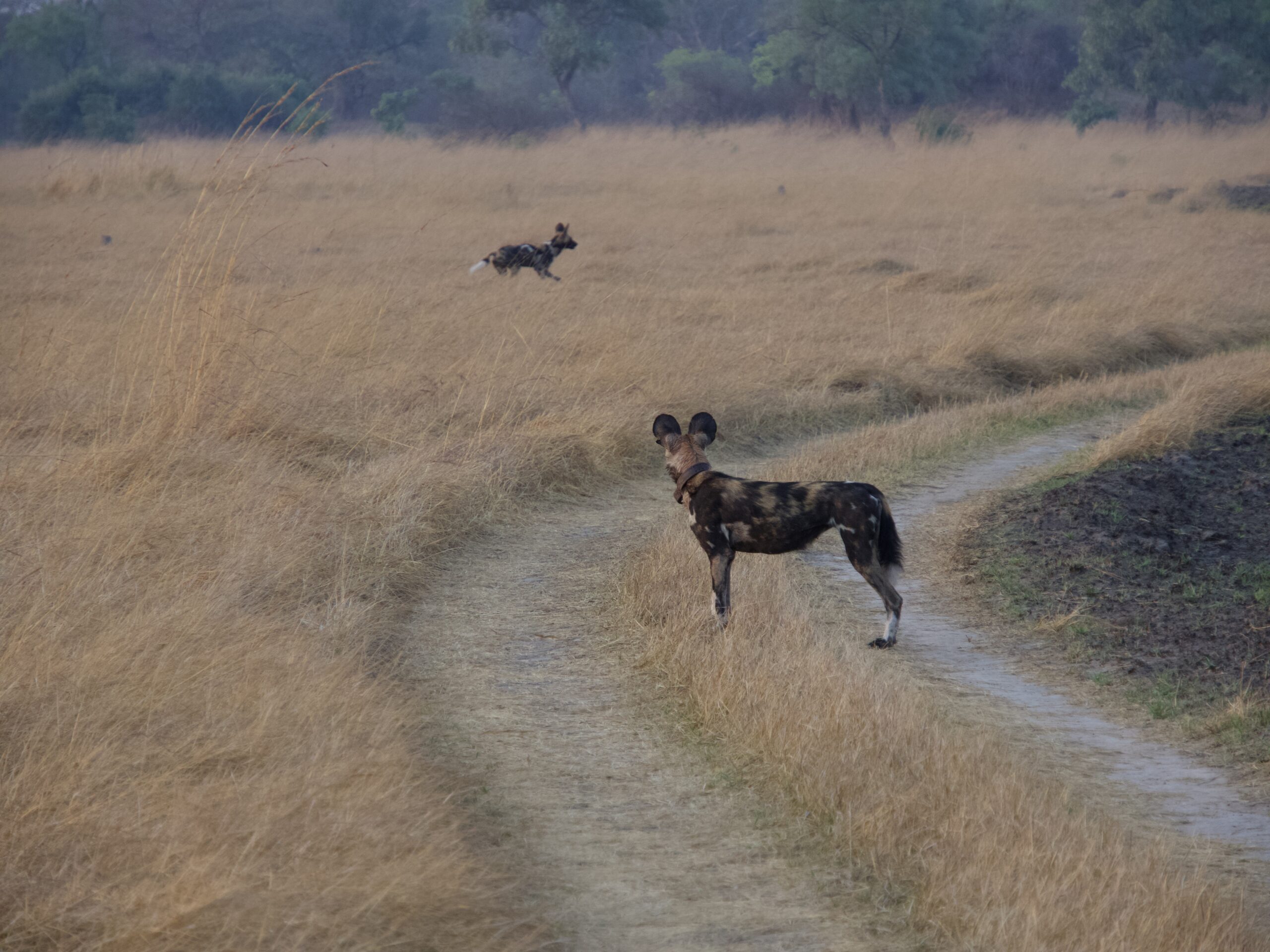 This was a very large pack. There was a female and all the pups – both the current litter and some older pups that I guess were from last year. The alpha female was looking across the plain and the pups were literally racing around. At times she sat down but it became clear that they were waiting for the rest of the pack to return from a hunting trip. You can see in the photo below that she was collared – part of the conservation and research work that is being carried out within Kafue. They are still an endangered species so the more that is known about their preferences and behaviour the easier it is to ensure they survive.